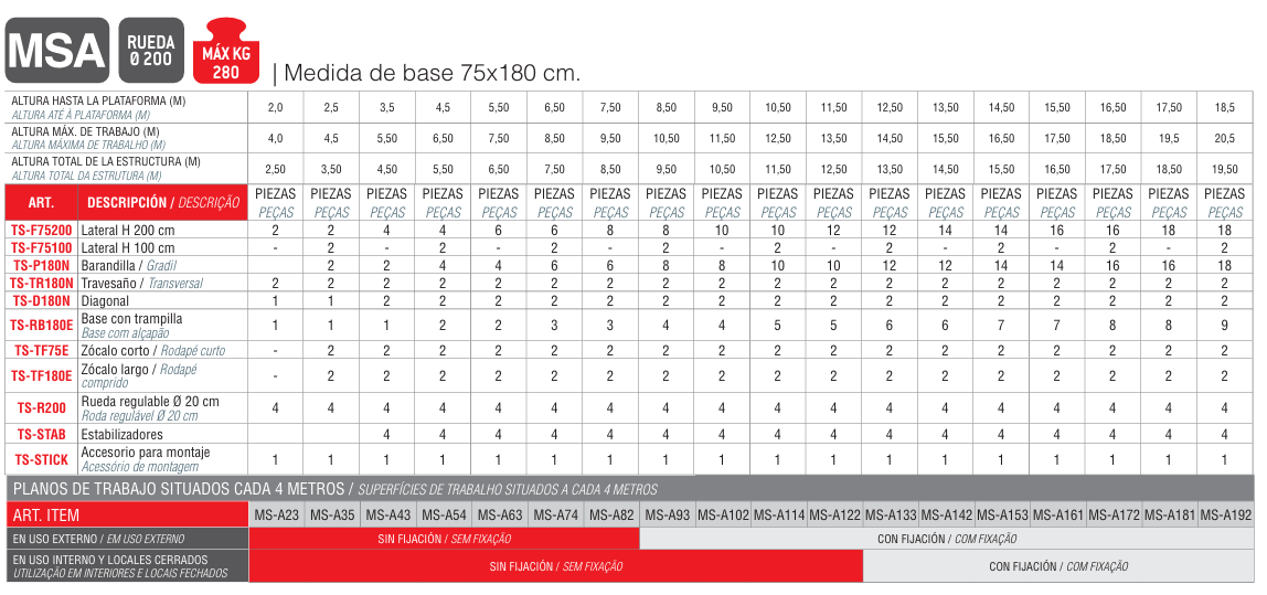 - O andaime de montagem segura TOP SYSTEM 75 é fabricado em alumínio extrudado com espessura mínima de 1,5 mm e inclui um sistema de montagem segura onde o guarda-corpo pode ser montado por baixo e o operador pode acessar a área de trabalho totalmente protegida, minimizando o risco de queda de altura.