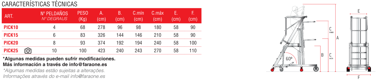 ESCOLHA A ALTURA- A escada PICK é feita de alumínio e equipada com uma plataforma de trabalho e uma plataforma de elevação elétrica. Ela foi projetada para uso industrial, oficinas e armazéns; a plataforma permite o trabalho em altura, e a plataforma de trabalho elétrica permite a elevação de pacotes e fardos para armazenamento em prateleiras.